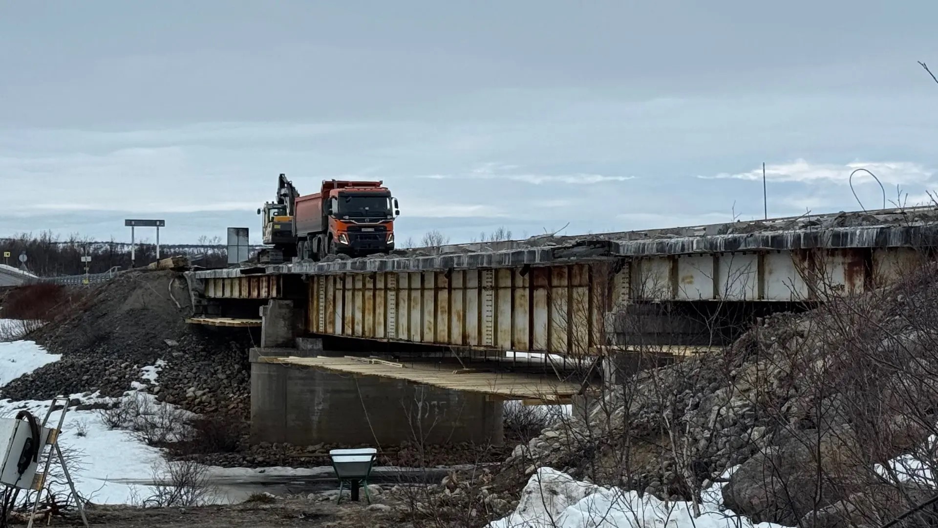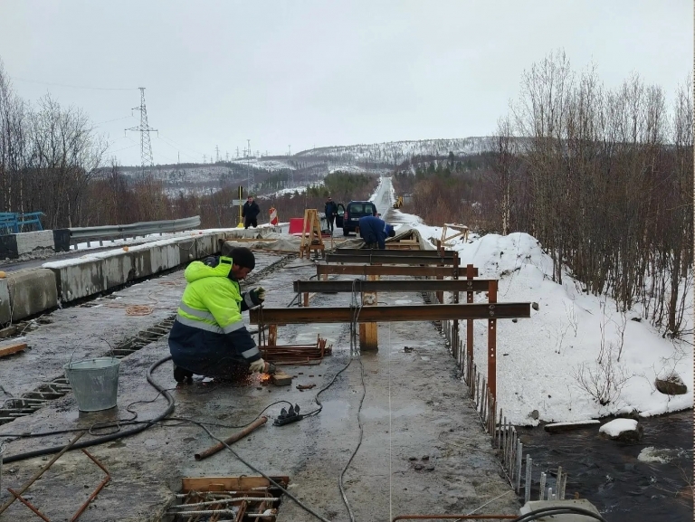 Не менее интенсивная работа идет и на мосту через реку Териберка. В данный момент мостовики