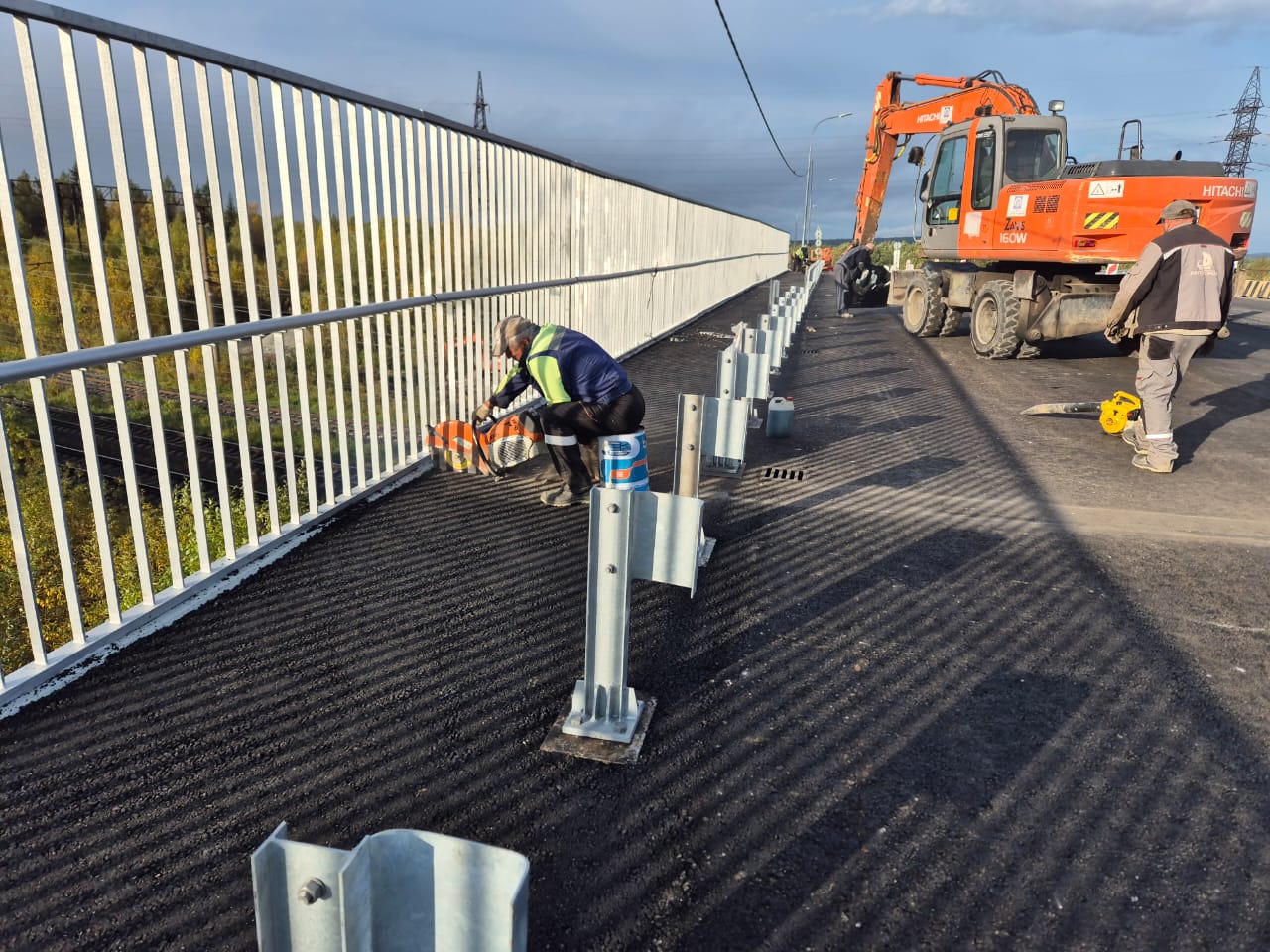 Ремонт путепровода через железную дорогу на км 1+890 объездной автодороги города Апатиты близится к завершению. Здесь практически закончены работы по установке водоотводных устройств. Мостовики выполняют устройство деформационных швов, защитного и барьерного ограждения. Ведутся работы по устройству асфальтобетонного покрытия, как на мостовом сооружении, так и на подходах к мосту. Общее выполнение составляет более 90 %.